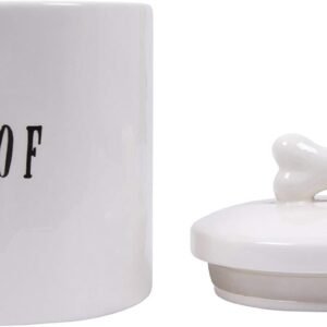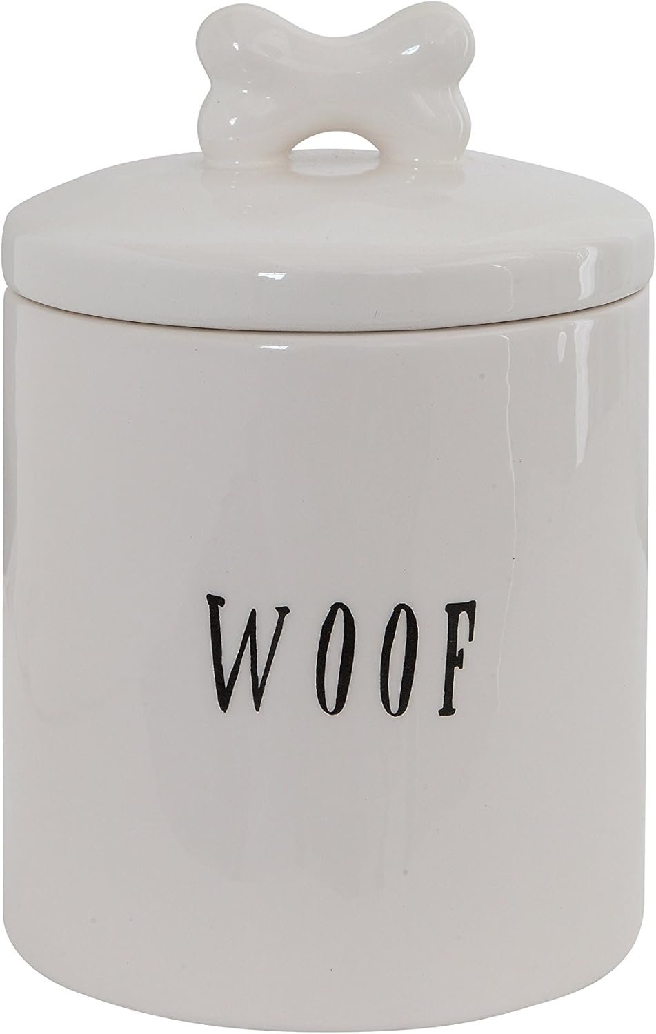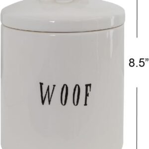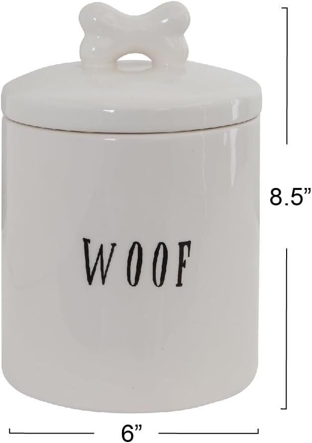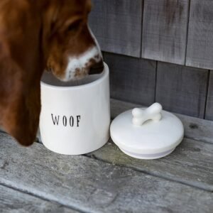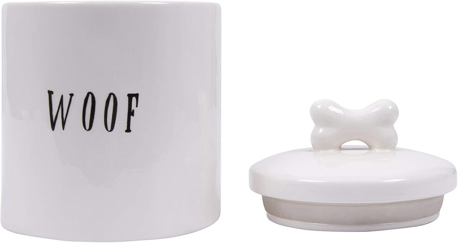 This whimsical ceramic treat jar features a “woof” message and lid with a bone-shaped handle
