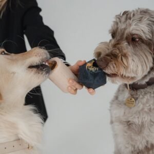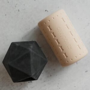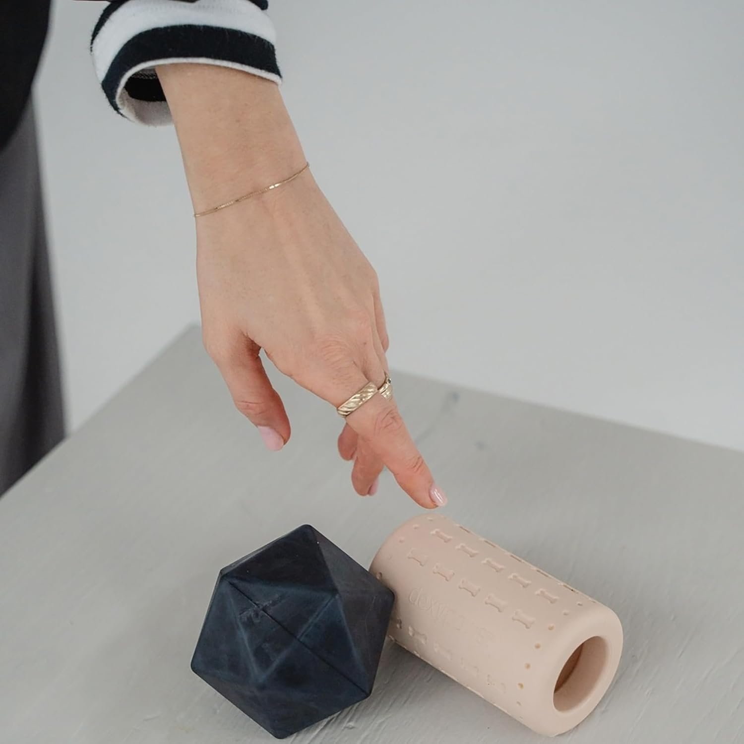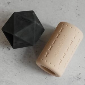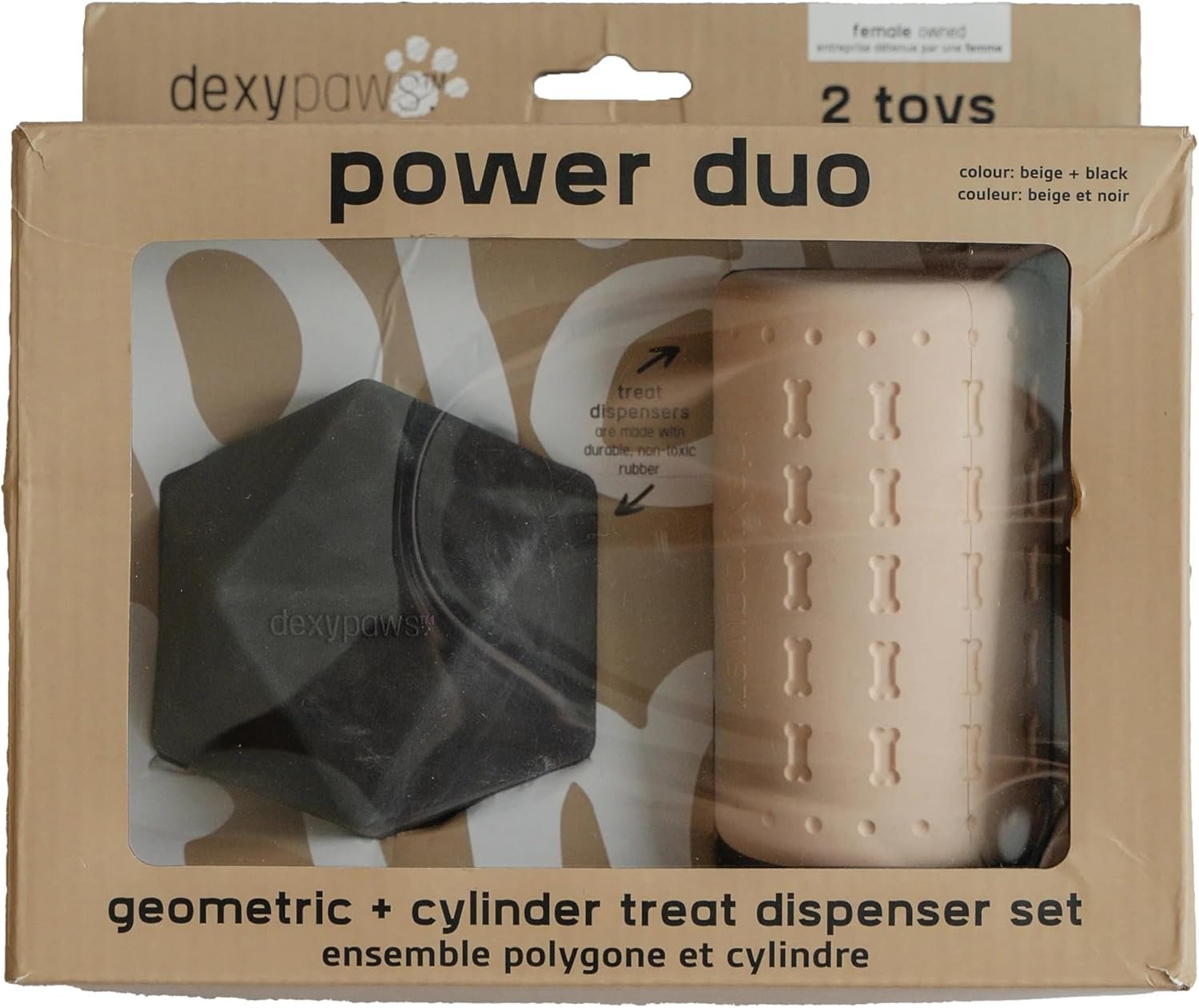 POWER DUO TOY SET: GEOMETRIC & CYLINDER – BEIGE & BLACK – Meet the Power Duo—the ultimate toy set for dogs who love to chew and stay engaged. Made from tough, durable rubber, these toys are built to withstand even the most powerful jaws, offering long-lasting play and satisfaction. The Geometric toy features unique ridges and grooves that not only provide a deeply satisfying chewing experience but also help support dental health. Paired with a cleverly designed treat dispenser, perfect for stuffing with snacks or peanut butter, this duo delivers mental stimulation and rewarding fun. It’s the perfect combination of strength, function, and entertainment for your power chewer! Designed to keep dogs mentally and physically active, this set helps reduce boredom and destructive behaviors by channeling energy into healthy play. Easy to clean and made from safe, non-toxic materials, it’s built for daily use and endless enjoyment. Whether used for solo chewing sessions or interactive play, the Power Duo is sure to become your dog’s favorite go-to toy.