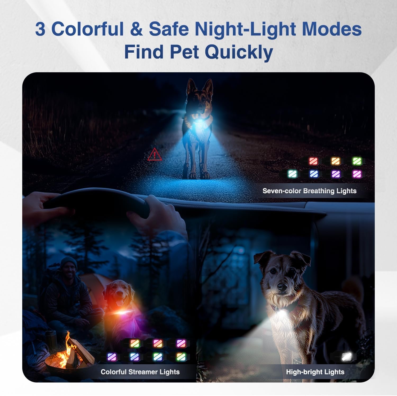 3 SAFE NIGHT-LIGHT MODES: Three safety anti-lost night-light modes of seven-color breathing lights & colorful streamer lights & high-bright lights on the receiver. Perfect for quickly locating your dog while camping or taking a night’s walk