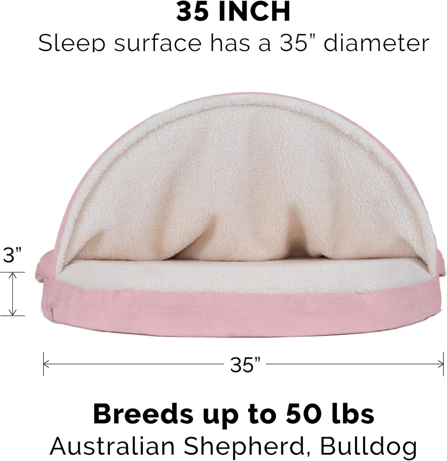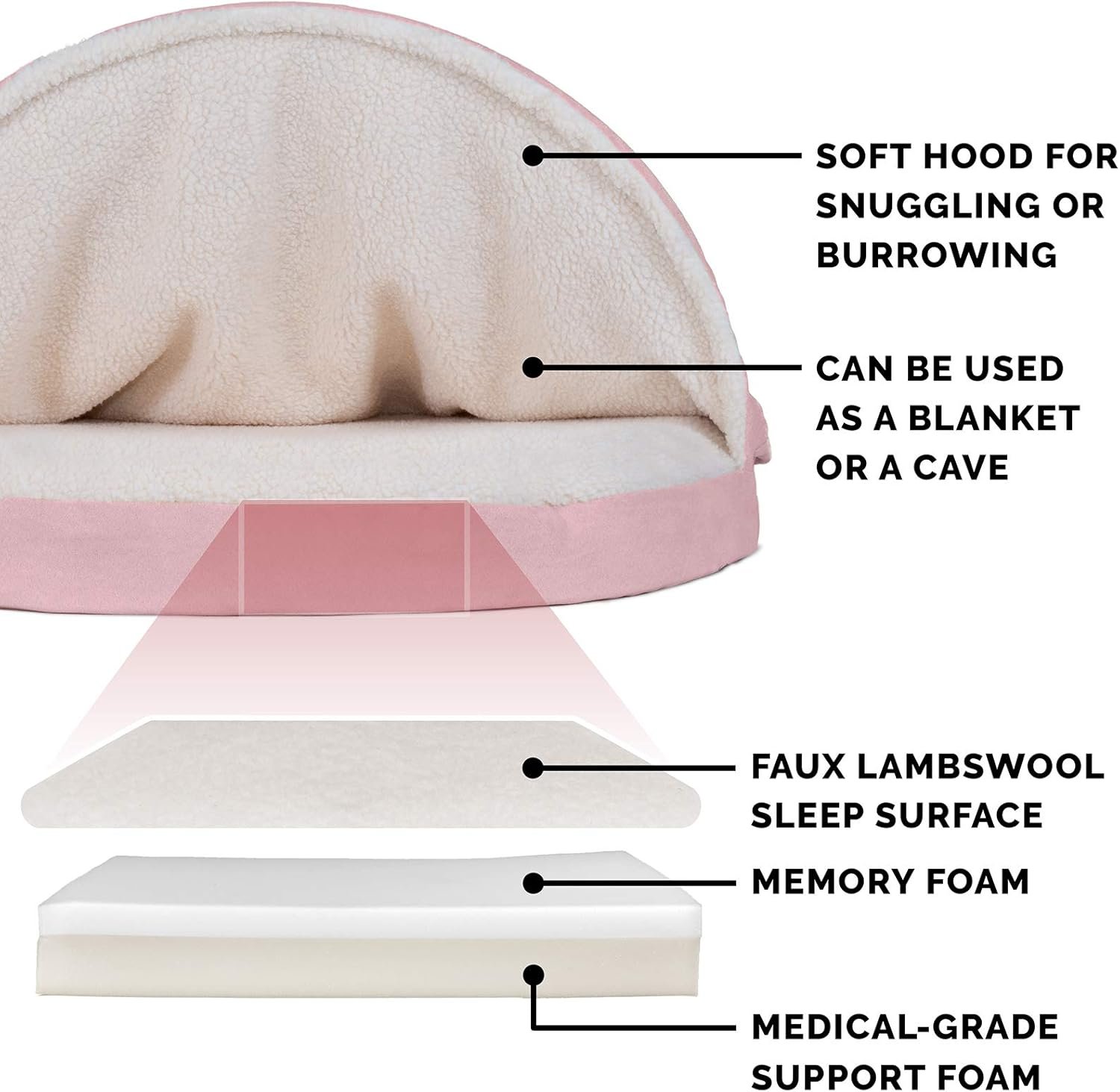 Undercover comfort is here with the Furhaven Sherpa & Suede Snuggery Dog Bed! If your pet is a snugglebug who loves to crawl under the covers, this burrow-style pet bed is a perfect solution for their sleep needs! Soft suedine fabric on the exterior and gusset provides a stylish, soft look that resists stains and cleans up easily. Woolly faux sheepskin sleep surface and hood lining is warm, insulating and a mix of polyester and acrylic making the pet bed cover completely washable. The soft hood features a flexible and removable hoop to best suit your pet’s sleep style and burrow habits. Use the hoop and the hood looks more like a cave allowing easy access to the interior. For pets who enjoy crawling under “blankets,” remove the hoop and they can snuffle their way in to their favorite sleep spot. Our laminated memory foam top pet bed core provides just the right amount of comfort and support to maximize your pet’s rest and relief. The memory foam top absorbs and holds your pet’s body heat for maximum insulation and warmth while conforming to your pet’s unique shape to best support joints and relieve pressure points. We pair the benefits of memory foam with a medical-grade polyurethane foam base to maximize its benefits and ensure the best support for your pet. All foam used in the manufacture of this product is made in the USA and has been certified and rigorously tested to ensure it meets standards for content, emissions and durability by CertiPUR-US. Easy to clean. Cover care: Remove from core before washing (see hang tag and/or seam label for care instructions). Foam care: Memory foam is highly absorbent. Spot clean with mild soap or enzyme-based cleaning spray. Rinse but DO NOT SOAK OR SUBMERGE. Press out moisture with a dry towel and air dry. A fan may be used to speed drying. Do not wring or place in machine dryer. Dry completely before use. Not for unsupervised use by animals with destructive chewing behavior.