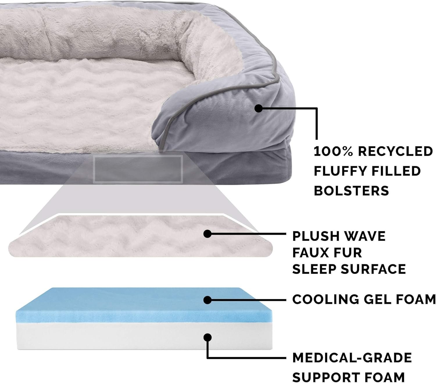 EASY ON JOINTS: The gel-infused memory foam contours to your pet’s figure to promote body alignment while also keeping your pet cool; the fluffy-filled bolsters help provide optimum support for the neck, back, hips, and joints for a more restful sleep