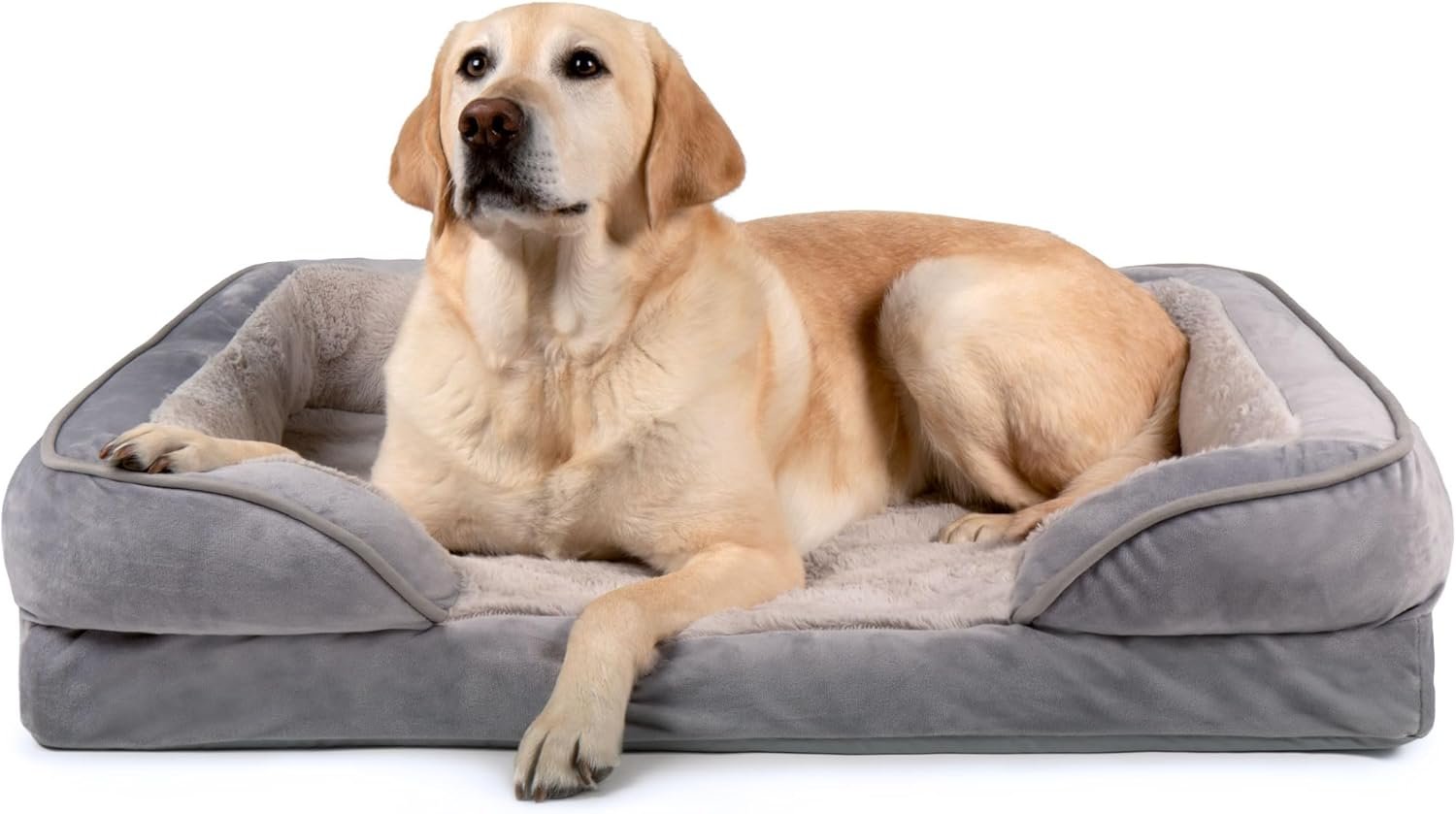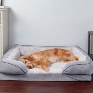 PET FRIENDLY DESIGN: The bed features a sofa design with three-sided bolsters that taper around the front, promoting enhanced security and providing additional high-loft cushion support for head resters, as well as cozy nestling nooks for burrowers