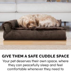 Pamper your pet with a new Furhaven Plush & Velvet L Chaise Dog Bed! A luxuriously soft plush sleep surface is complemented by velvet covered bolsters and gusset. Ultra plush faux fur provides a snuggly soft sleep surface and trims the edges of the bolster for a chic flair. The L-shaped bolsters support your pet’s back and hips, providing additional support. The L-shape also provides the perfect nook for pets that like to nest into comfort. The two raised, rounded bolster ends allow your pet to lay their paws or neck on the pillowed edge, helping to align the neck and spine. Memory foam is designed to work with your pet’s weight and contour to their body providing better overall support and relief from painful muscles and joint discomfort. Available in various stylish colors and diverse sizing options so your pet can sprawl and lounge the day in maximum comfort and style. Easy to clean. Cover care: Remove from core before washing (see hang tag and/or seam label for care instructions). Foam care: Memory foam is highly absorbent. Spot clean with mild soap or enzyme-based cleaning spray. Rinse but DO NOT SOAK OR SUBMERGE. Press out moisture with a dry towel and air dry. A fan may be used to speed drying. Do not wring or place in machine dryer. Dry completely before use. Not for unsupervised use by animals with destructive chewing behavior.