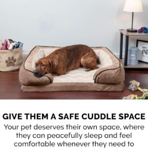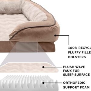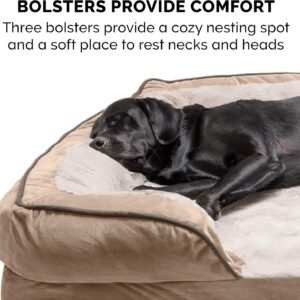 PET FRIENDLY DESIGN: The bed features a sofa design with three-sided bolsters that taper around the front, promoting enhanced security and providing additional high-loft cushion support for head resters, as well as cozy nestling nooks for burrowers