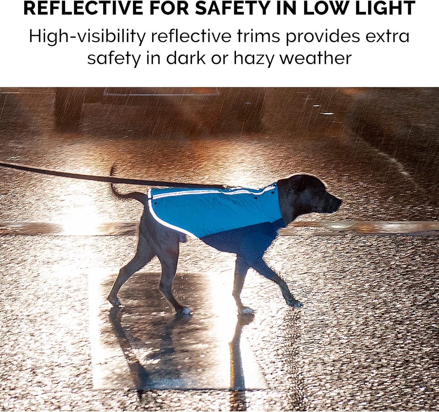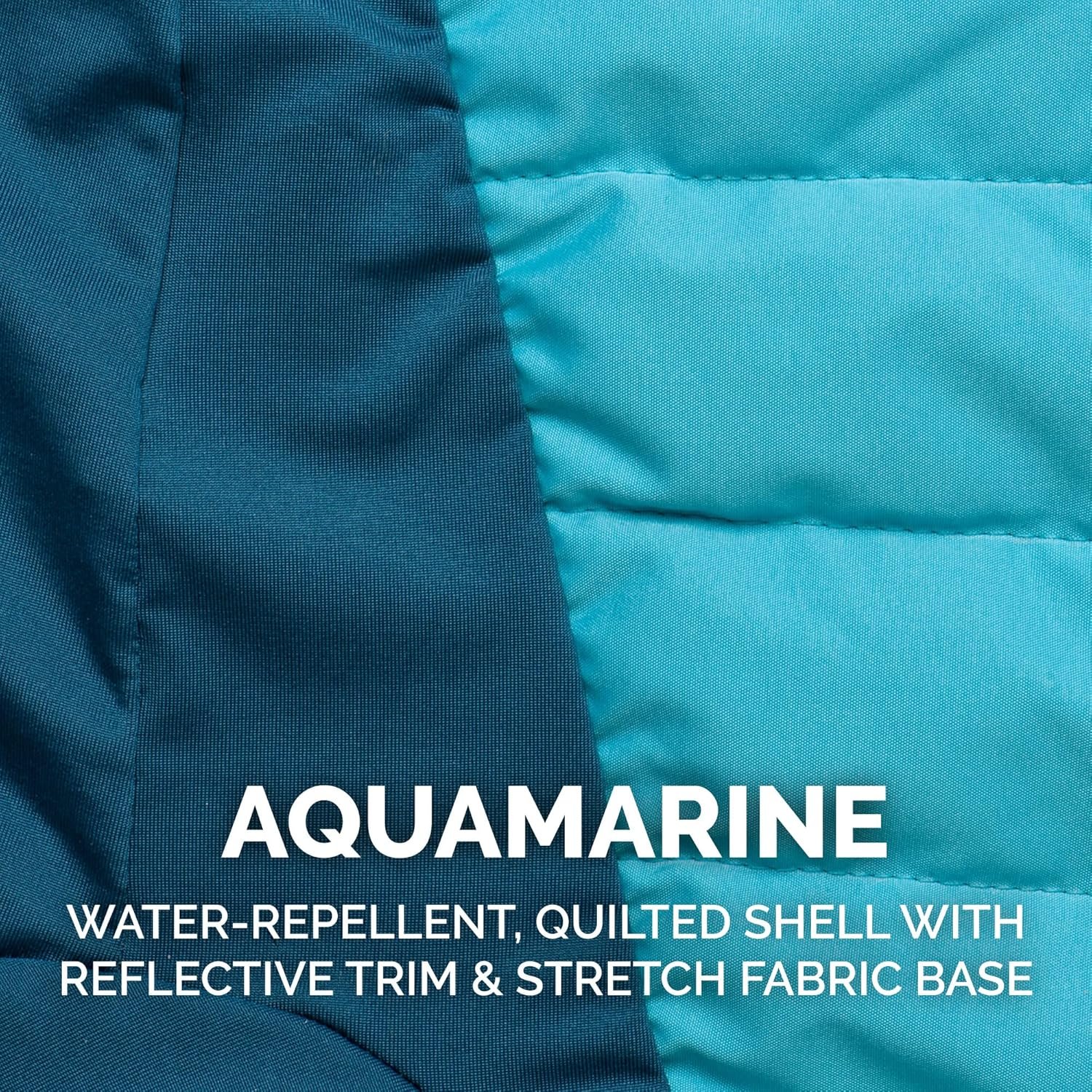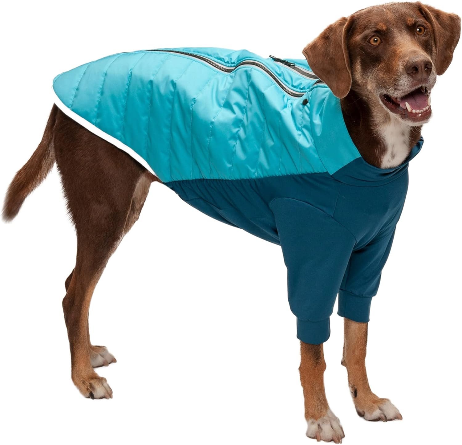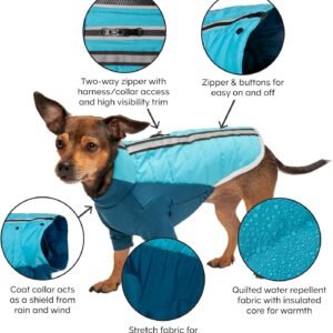 Get outdoors no matter the season with this Furhaven Water-Repellent Pro-Fit Active Dog Coat. Choose your color based on your reflective needs – the aquamarine color features a reflective trim while the chrome color features both reflective trim and reflective quilted jacket panel. This jacket is designed with a stretch panel for a deluxe custom fit and sleeves to protect your dog’s legs from the elements. With insulative fiber core and water-resistant fabric you dog is sure to stay warm and comfy. Designed with a reflective zipper opening for easy access to your dog harness or collar. The full-length zipper makes for easy on and off. No matter the season, adventure is just a zip away.