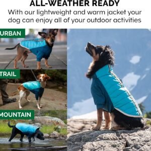 AVAILABLE VARIANTS: The dog jacket comes in Chrome and Aquamarine; it’s also available in Extra Small, Small, Medium, Large, Extra Large, and 2XL
