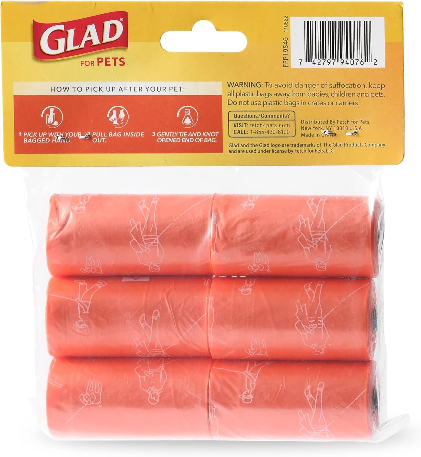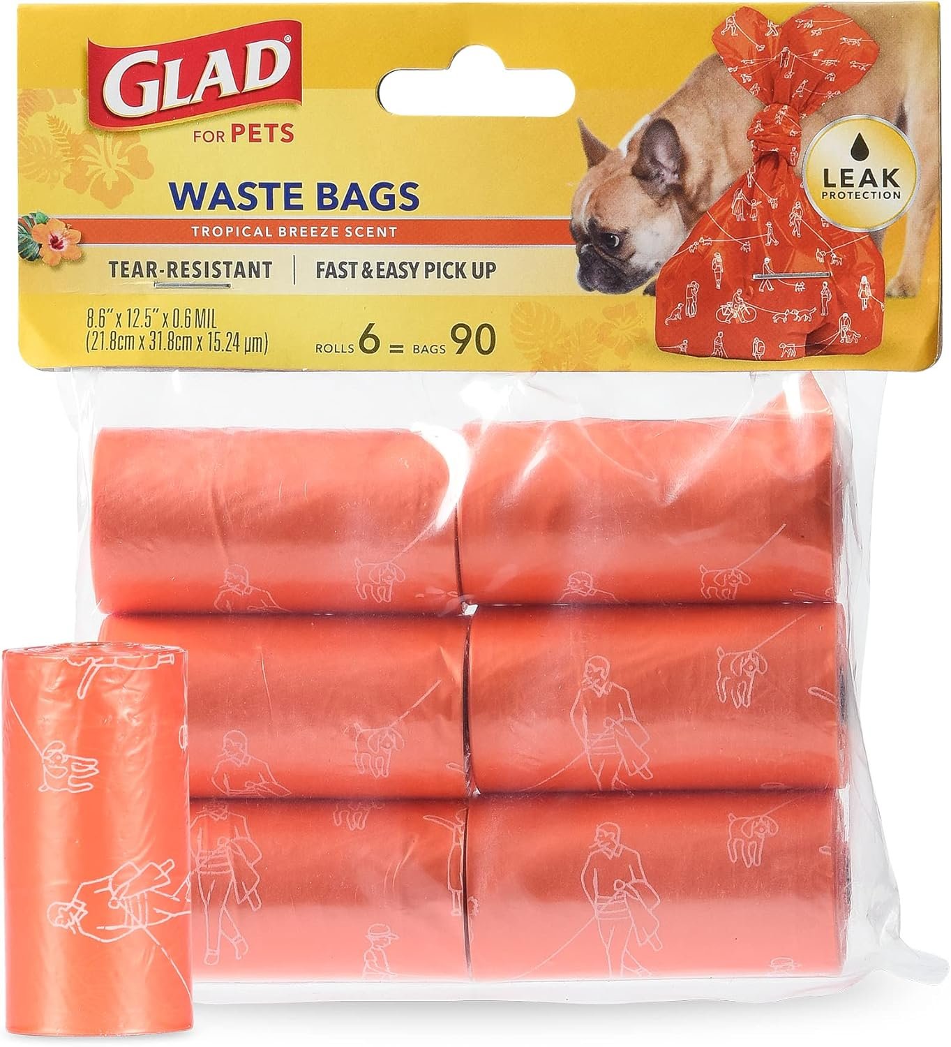 Glad for Pets Waste bags, dispensers, and training pads are dependable and specially designed for easy clean up! Built with glad level strength, everyday training and clean up accessories bring innovation to each stage of your dog’s life, from training pads using activated carbon technology, to daily waste bags with dispensers. With the Glad for Pets large tropical breeze scented dog waste bags, you’ll never be left in a lurch without a dog poop pick up solution when out with your pet! Cleaning up after your dog may not be fun, but Glad for Pets makes it easy to be a responsible owner. This package includes 6 rolls of doggie waste bags for a total of 90 bags altogether. These dog waste bags are scented with tropical breeze, covering unpleasant odors. These bags are heavy duty and tear-resistant for leak protection while picking up pet waste. The doggie bags for poop help you clean up quickly after Fido does his business. Pick it up and toss it in the trash. It’s that easy! These dog poop bags are must have dog supplies. These poop bags for dogs are not strictly for outdoor use, they’re also perfect for inside your home for your other animals that may leave an unwelcome gift or two for you on your floor or furniture. They’re handy in the car, camping, or anywhere you take your pet. These poop bags are made from heavy duty material for ultimate holding power and sanitary poop pickup. Using these waste bags is as simple as can be! 1. Take the Glad waste bag and pull it over your hand like a glove. 2. Pick up waste with your bagged hand. With your other hand, grasp open end of the bag and pull it inside out. The waste will now be inside the bag. 3. Gently tie and knot the end until completely closed. Dispose of safely. SAFETY WARNING: to avoid danger of suffocation, keep all plastic bags away from babies, children and pets. Do not use plastic bags in crates or carriers.