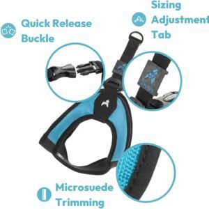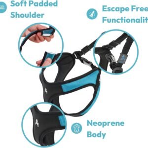 Escape Free Turquoise Dog Harness – Our Escape Free Easy Fit dog harness no pull design reduces space around the back making harder for your dog to escape our no pull harness by backing away during the walk. Make sure our no pull dog harness is properly sized by checking to see if there is no space around the back of your dog when the harness is pulled fully. Incorrect sizing will lead to escaping of the harness.