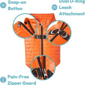 Ultra Lightweight – Weighs less than 3 slices of sandwich bread, your pup barely even feel it. Easy-to-wear. Easy-to-pack. And easy-to-store. [If in between sizes, please size up for added comfort!]Windbreaker – The 100% polyester fillings provides insulation to keep warm and is breathable to prevent from overheating when your pup’s in motion in our dog puffer coat.