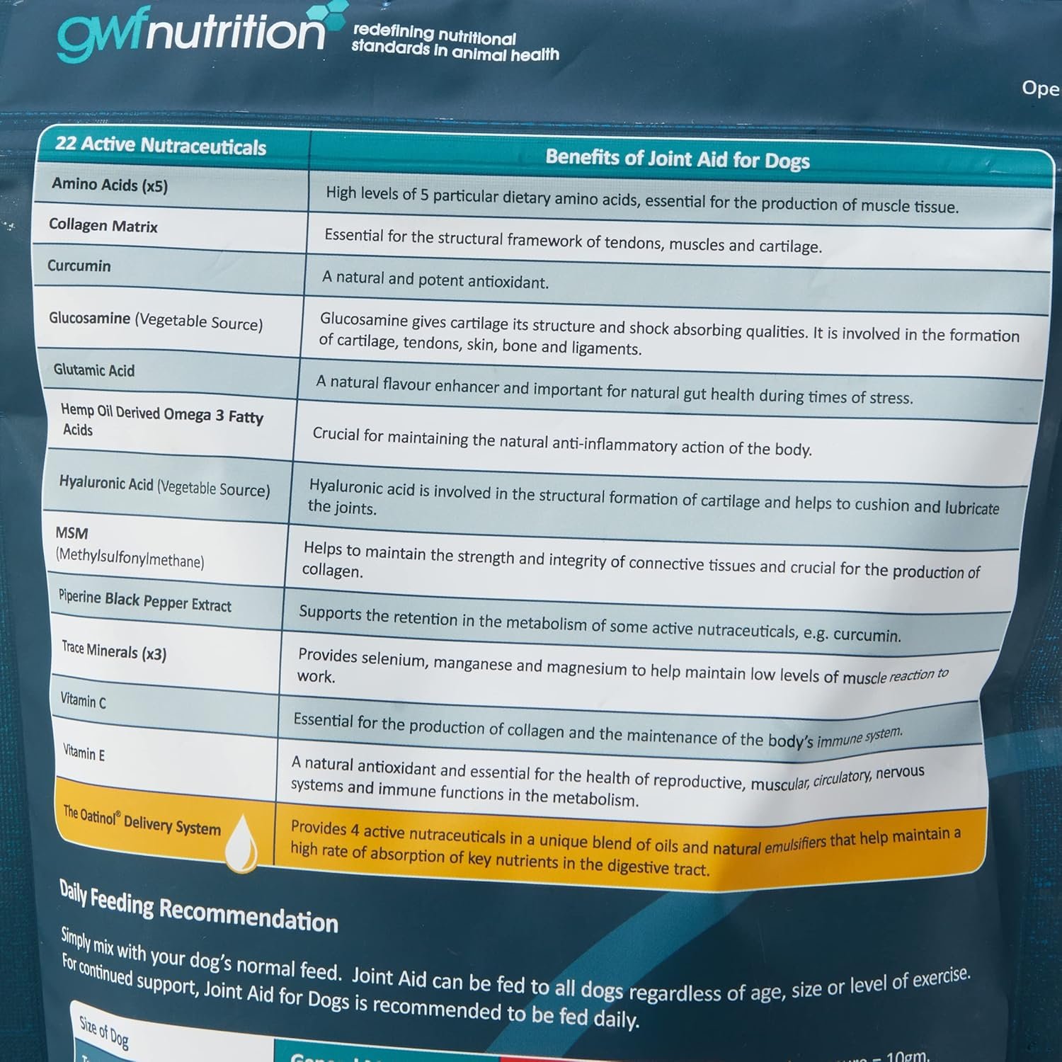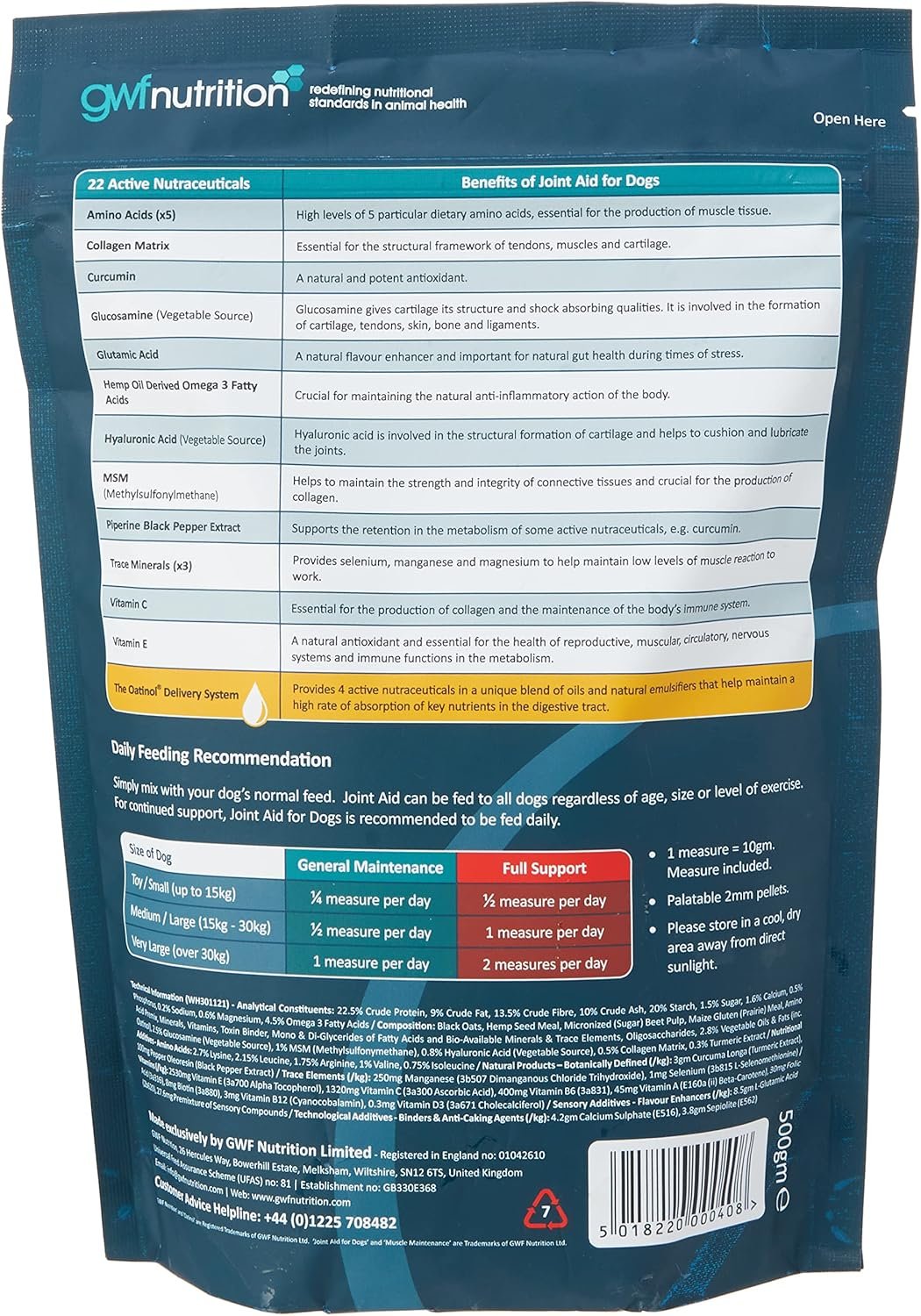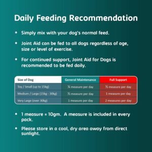 Through the use of 11 specific nutricines, Joint Aid provides support to the normal wear and repair of cartilage, synovial fluid, tendons and joints in the skeletal structure, helping to maintain flexibility of movement throughout the life of the dog. Key Benefits: Helps maintain the natural anti-inflammatory actions of the dogs’ metabolism. Supports the normal wear and repair of cartilage and synovial fluid. Provides the building blocks required for natural replenishment. Wheat gluten free. Contains 11 active ingredients, including: chondroitin, collagen, curcumin, glucosamine, glutamine, MSM and vitamin C, plus Oatinol derived: antioxidants, polar lipids, beta glucans and galactolipids. Contains the Oatinol Delivery System to maintain a healthy digestive tract and a high rate of absorption of essential nutricines, vitamins and trace elements. — Feeding Recommendation 1. Simply mix with the dogs’ normal feed. 2. Joint Aid for Dogs can be fed to all dogs, regardless of age or level of exercise. 3. For continued support, Joint Aid for Dogs is recommended to be fed on a daily basis. Routine Maintenance Quantity Day Toy small (up to 15kgs) 5 gms (? measure) Medium large (15kgs – 30kgs) 10 gms (1 measure) Very large dogs (over 30kgs) 20 gms (2 measures) Measure included