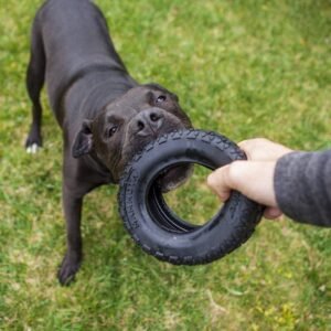 DURABLE DOG CHEW TOY: This tire shape rubber dog toy has a rugged textured surface for better grip. It is ideal for interactive playing and tossing, but will also keep your pup entertained during solo play.