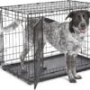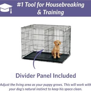 Dog crate includes a divider panel, durable & leak-proof plastic pan, protective rubber feet, carrying handle, and customer support team based in Indiana