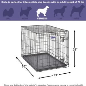 iCrate single door dog crate measures 36.6 x 21.9 x 24.5 inches and is suitable for intermediate dog breeds with an adult weight of 40 to 70 pounds. If your dog’s weight or measurements are on the higher side for this crate, we recommend buying the next crate size up