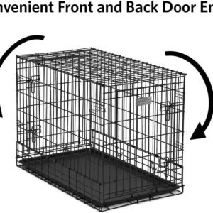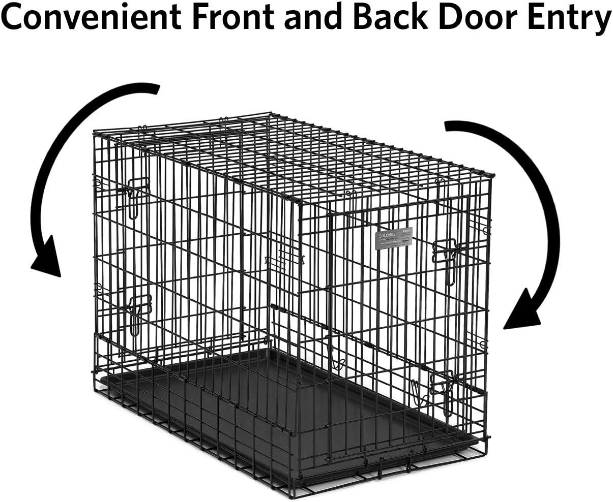 The Solution Series by MidWest Homes for Pets is glad to offer our double door folding metal dog crates designed specifically to fit most SUVs, vans and larger vehicles. These dog crates are made to keep your dog (or other pets) safely contained in your SUV so you can concentrate on driving them to the dog park. Our SUV crates are narrower in design when compared to a standard size dog crate because these are designed to fit side-by-side in the cargo area of your SUV. Each folding metal double door crate has a front and back door configuration for easy accessibility to your dog when using the dog crate in your SUV vehicle. Each door comes with two, heavy duty slide-bolt latches so you can feel confident your dog is safe and secure in the metal dog crate while you’re driving. Each SUV folding metal dog crate comes with a durable leak-proof plastic pan, two doors (front & rear), a long lasting black e-coat that prevents rust and a carrying handle. Our SUV dog crates also fold flat when not in use for easy travel and portability. We at MidWest Homes for Pets understand that your dog is a part of your family and that’s why we ensure our dog crates are manufactured with the highest quality control standards creating a safe home for your pet that you can feel confident with. MidWest Homes for Pets stands behind the quality of our products with a 1 Year Manufacturer’s Warranty. If you have any questions about our Solution Series SUV dog crates our customer service department would be glad to help you. MidWest customer service can be contacted at: 1-800-428-8560, available 9:00 AM – 4:00 PM, Monday – Friday.
