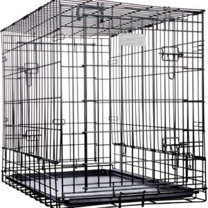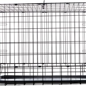 SUV metal dog crate includes two secure doors (front and rear), an attractive and lasting black e-coat which prevents the metal from rusting, a durable leak proof plastic pan and carrying handle