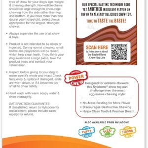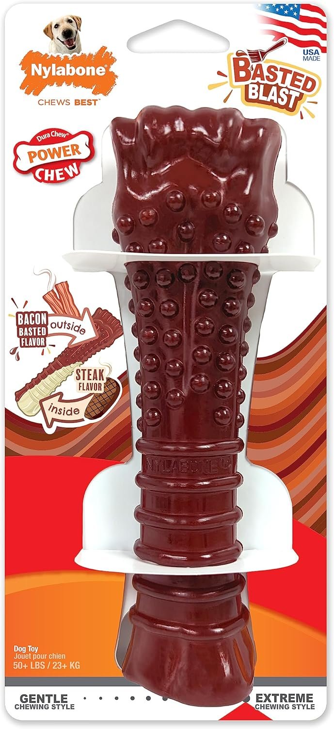 Basted Blast chew toys will surprise your dog with 2 indulgent flavors in 1 long-lasting chew toy! Nylabone innovated an exclusive basting technique that adds yet another flavor on top of an already delicious chew toy. As your dog chews, the lighter color inside will be revealed. This means they discovered the delicious steak flavor and can keep chewing for ongoing satisfaction! It’s time to taste the baste.