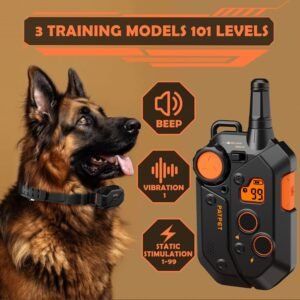 Ideal for training recalcitrant dogs. Designed for professional trainers, this electric shock collar has 2 channels, 3 training modes, 101 levels (beep, vibration and 99 levels of static stimulation) and supports simultaneous control of 2 dogs