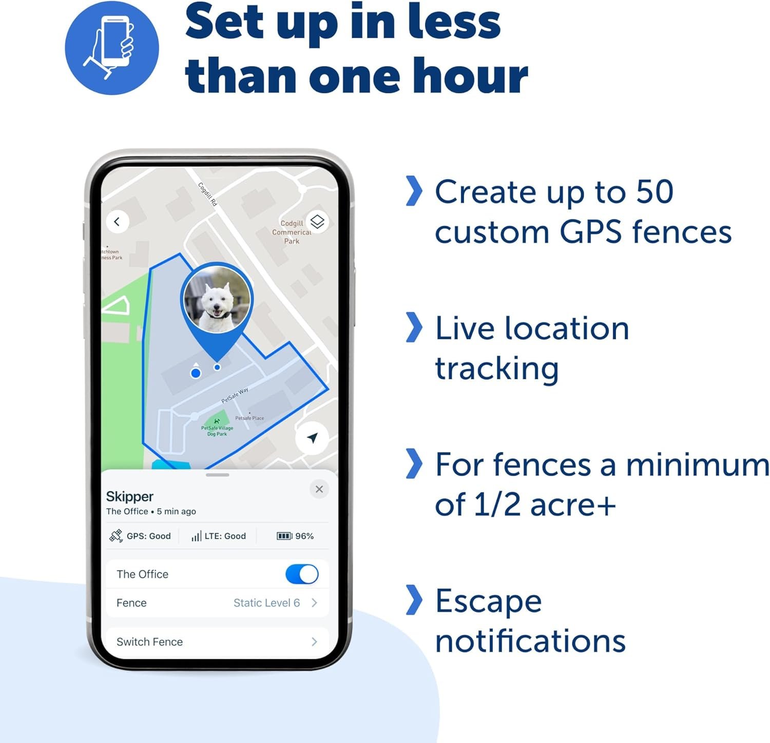 Set Custom Virtual Fence Boundaries: Use the MyPetSafe smart phone app to create up to 50 custom fences and receive push notifications if your dog crosses them