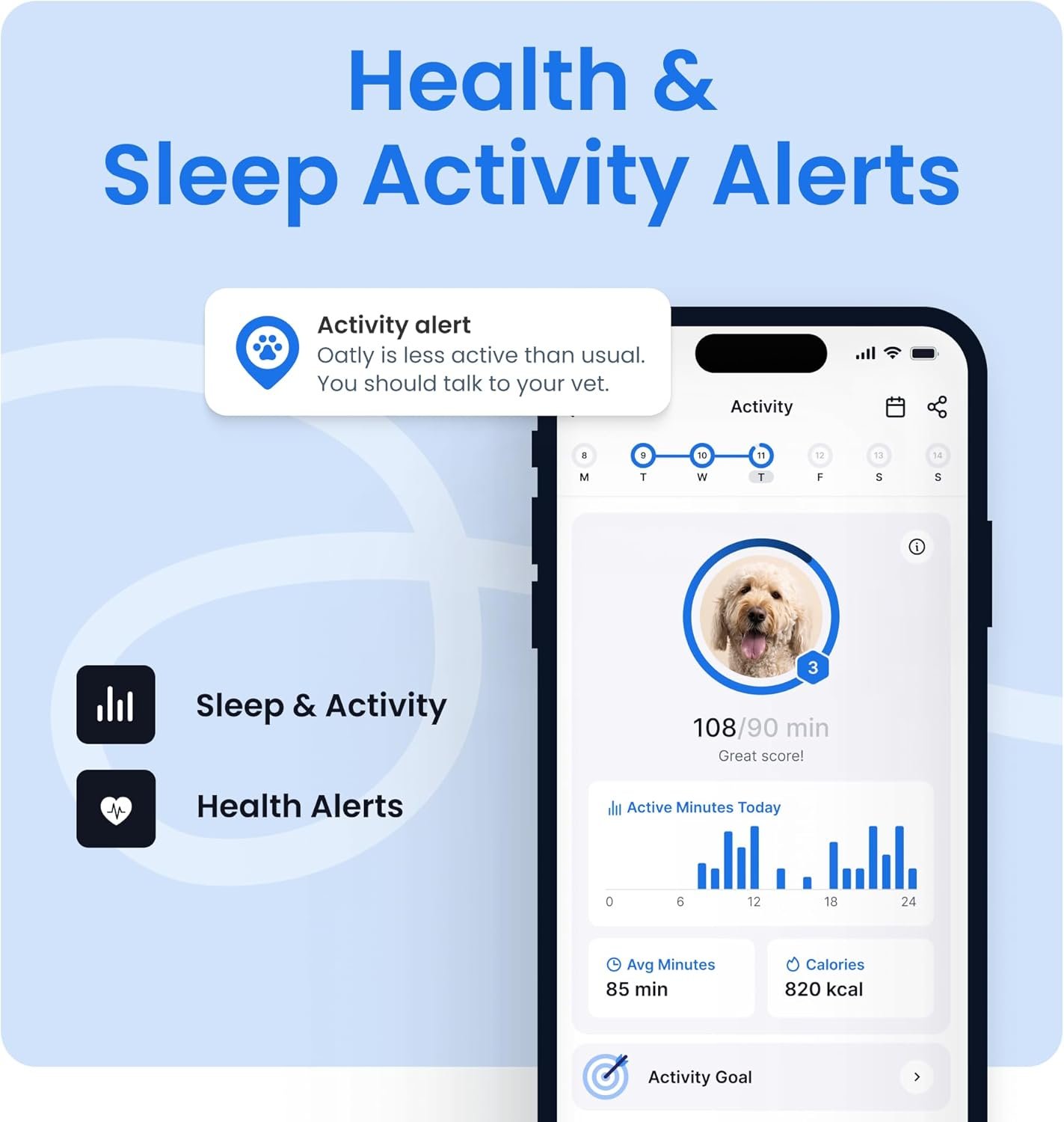 HEALTH, SLEEP & ACTIVITY MONITORING: Stay on top of your dog’s wellness with daily insights into their sleep and activity. Get notified of unusual changes so you can act early.