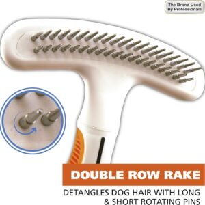 Detangling Rake – The two rows of `long and short rotating stainless-steel pins remove excess outer coat hair or fur and provide light deshedding and detangling