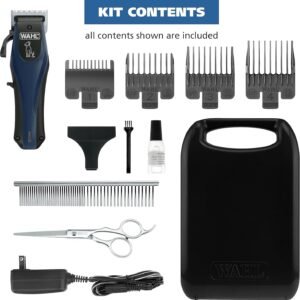The Wahl Power Pro Lithium Ion Rechargeable Cordless Dog Grooming Clippers contains a heavy-duty motor for cordless electric pet hair clipping and shaving, even the thickest of coats! The advanced lithium-ion battery has a quick recharge time of 3 hours providing up to 2 hours of run time, making it perfect for long grooming jobs. This clipper also features a quick charge feature; just charge for 15 minutes and have enough run time for a quick trim. This pet grooming kit features a cord cordless design – simply plug the clipper into charge and unplug when ready to use with cordless convenience or use it while plugged in for an endless stream of corded power. Wahl’s pet clippers for dogs has self-sharpening blades that cut smoothly and stay sharper longer compared to the competition. The included taper lever also makes it easy for blending or fading cutting lengths in between guard sizes. The ergonomic handle ensures comfortable maneuverability while tackling hard-to-reach areas like between the paw pads or underarms. Our smart charging indicator light lets you know when the battery needs charging: a solid green light means fully charged, solid red means the unit is charging and flashing red means the unit has low power, needing a charge. This complete dog grooming kit has all the tools needed to keep your pup looking its best. The included accessories (trimmer oil, cleaning brush, 4 clipper guards in sizes 1/8”, 1/4″, 3/8”, 1/2″, stainless steel scissors, stainless steel comb & hard handle case) make maintenance a breeze and ensure long-lasting use. It’s easy to see why groomers rely on the Wahl brand for precision trims on their furry clients. If your furry friend frequently sheds or has thick fur, these dog clippers for grooming will have your pup appear picture-perfect with no stress required from you! Get ready to enjoy painless pet grooming at home with this powerful clipper. Wahl pet grooming kits are consistently the brand used by professionals and the of choice for those who seek high-quality, long-lasting pet grooming electric machines for home use. Not for international use, Made for USA electrical wall outlets only. If you have any questions about use or maintenance, don’t hesitate to contact us! When not in use always unplug charger from unit. Product in packaging may not be the same as photo due to continuous improvements to the product. Note: We test our clippers for cutting performance prior to packaging with a hygienic fiber. We do our best to clean the product to remove any testing particles, but it is possible a few may remain. They are not hair and can be simply wiped off. To achieve the best results, ensure you wash, dry, and brush your pet before clipping. This will remove any debris and extra loose hair in your pets coat to help make the clipping process smoother.
